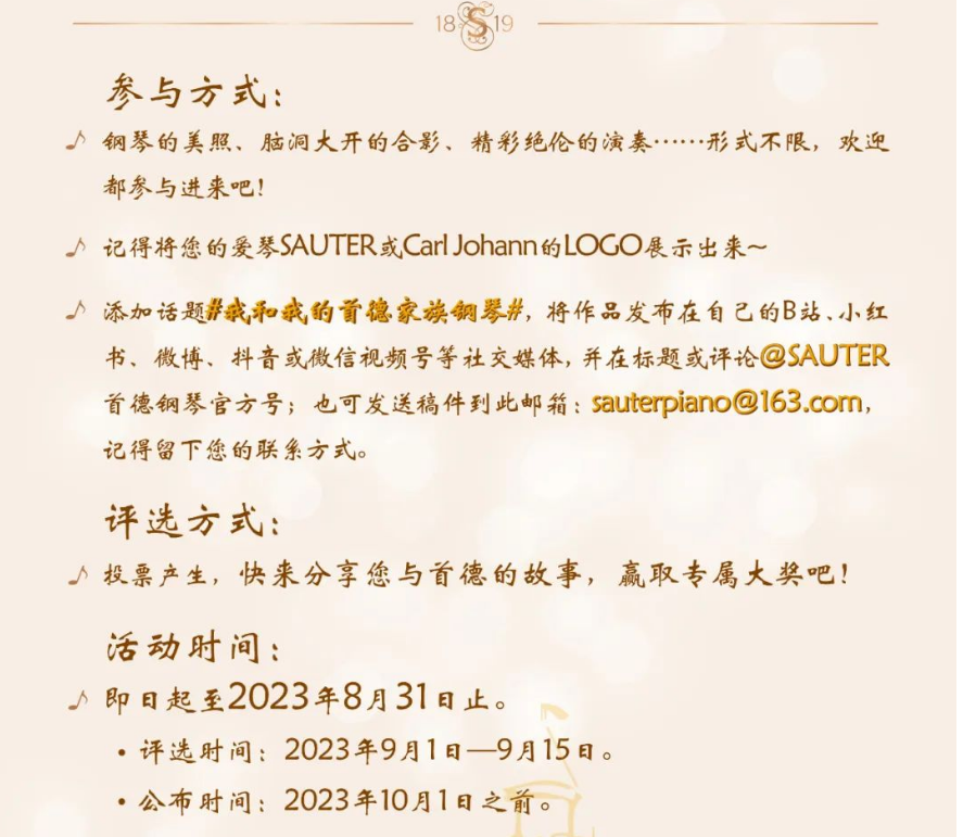 ④添加話題 #我和我的首德家族鋼琴# 發(fā)表在您的個(gè)人社媒頻道,并在標(biāo)題或評(píng)論@首德鋼琴官方號(hào);或也可發(fā)送稿件到此郵箱:sauterpiano@163.com,記得留下您的聯(lián)系方式。